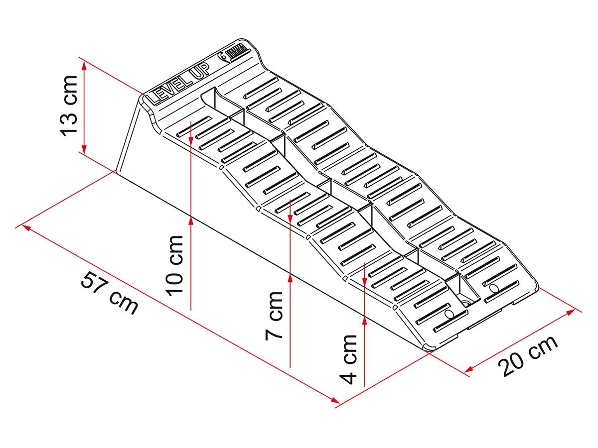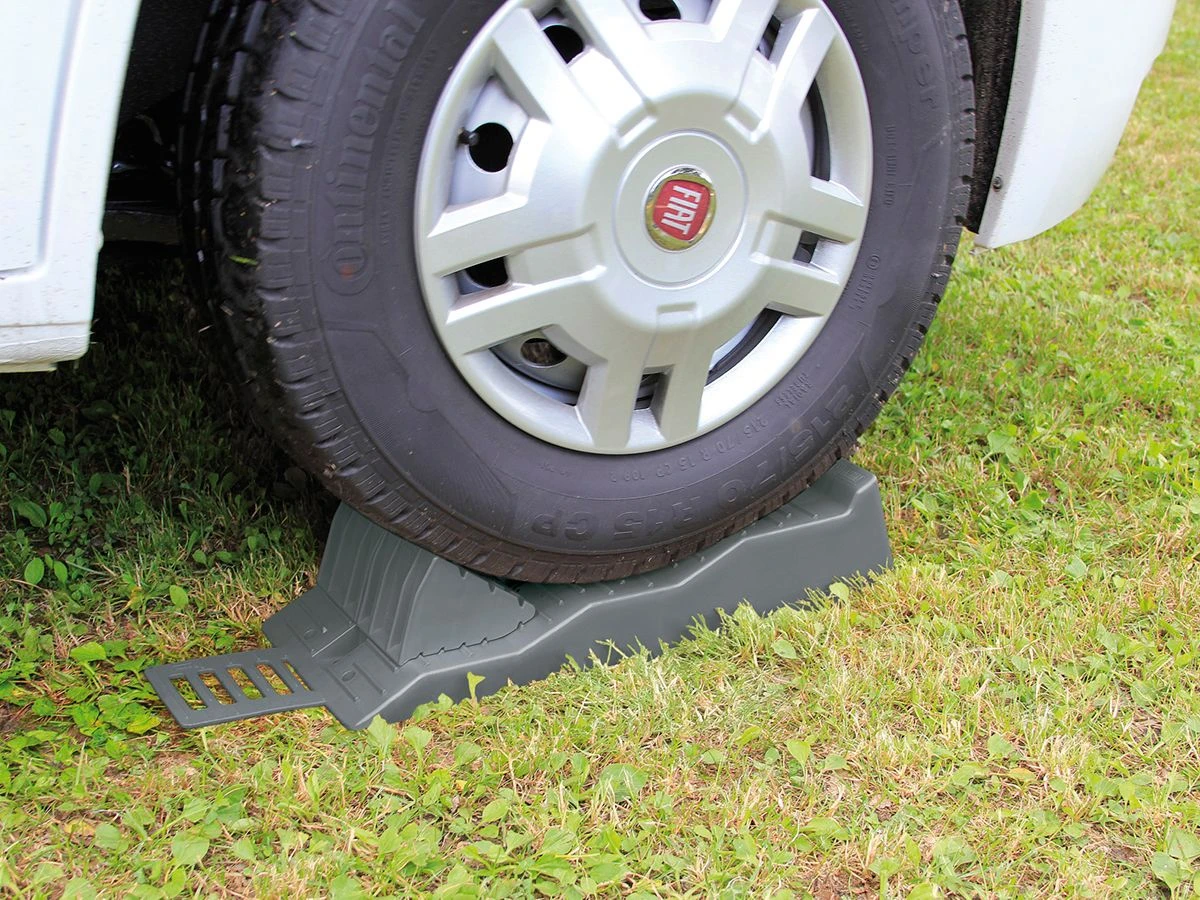 Das Fiamma Level Up, bestehend aus 2 Auffahrkeilen, sorgt dafür, dass Ihr Fahrzeug auch auf einer unebenen Fläche auf die gewünschte Höhe gebracht werden kann. Die Keile sind UV-beständig und haben eine rutschfeste Oberfläche.