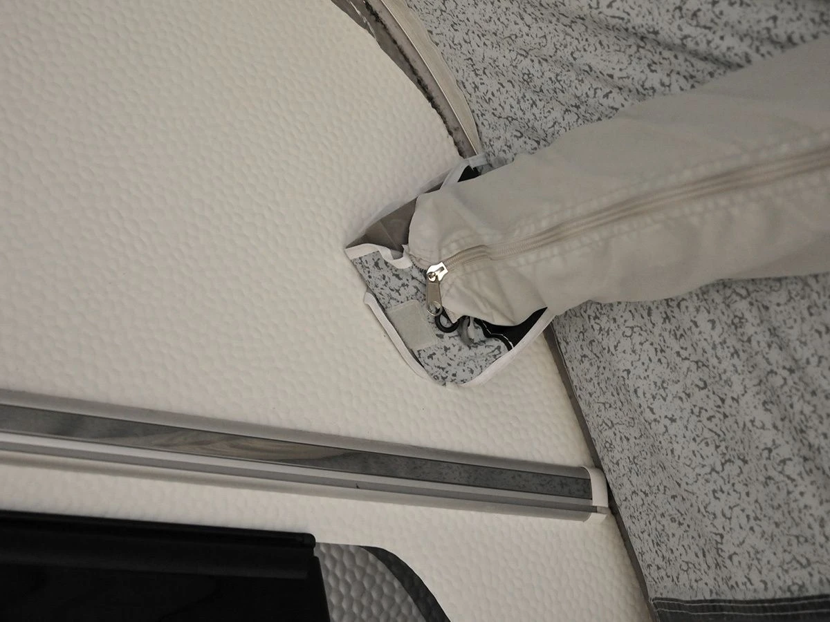 Die Vorder- und Seitenwände des Jupiter Easy Air lassen sich mit einem Reißverschluss entfernen, sodass Sie das Vorzelt auch als großzügiges Sonnendach nutzen können. Alle Wände haben große Fenster, die für ausreichend Lichteinfall sorgen. Das rechte Seitenfenster ist zudem mit einem Moskitonetz mit transparenter Abdeckklappe für zusätzliche Belüftung an heißen Sommertagen ausgestattet. Alle Fenster können mit den mitgelieferten Vorhängen von innen abgedeckt werden. Zusätzlich können alle Wände ein wenig hochgerollt werden, um einen bequemen Eingang zu schaffen. Sie können aus vier verschiedenen Eingängen wählen, um das Vorzelt zu betreten. An der First unterhalb des Dachüberstands befindet sich eine Belüftungsöffnung, die mit einem Reißverschluss geöffnet oder geschlossen werden kann. Das Vordach ist mit leichten Aluminiumstangen für eine schlanke Silhouette und zusätzliche Stabilität ausgestattet. Bodenschürze, Radabdeckung, Tragetasche, Heringe, Spanngummis und Sturmgurte werden mitgeliefert und komplettieren das Jupiter Easy Air, damit es sofort losgehen kann.