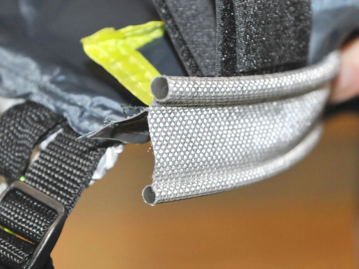 Die einzige verbleibende Zeltstange, ist für das Vordach. Dazu ist eine Glasfaserstange enthalten, die Sie leicht durch den Schlitz schieben und befestigen können, sobald der Rest des Zeltes aufgeblasen ist.