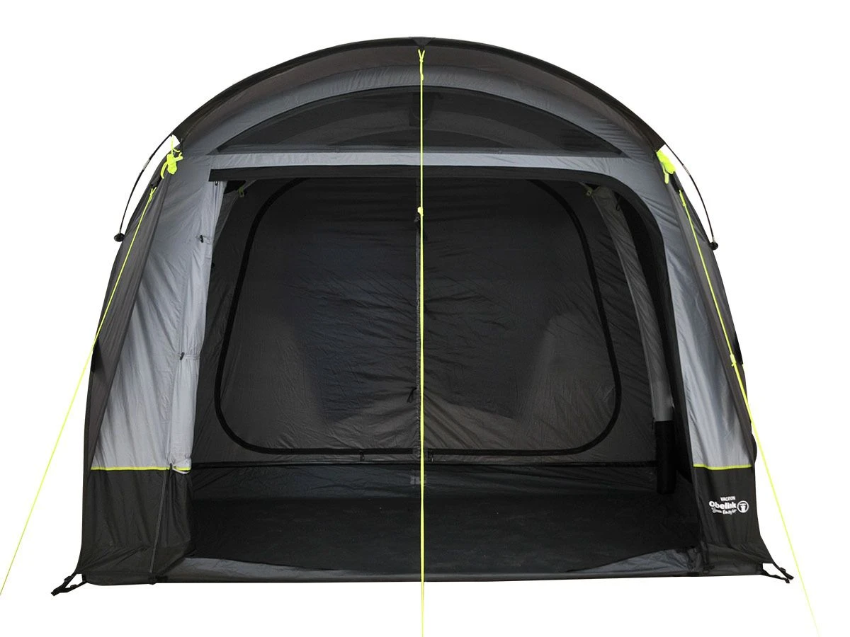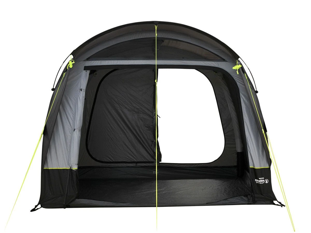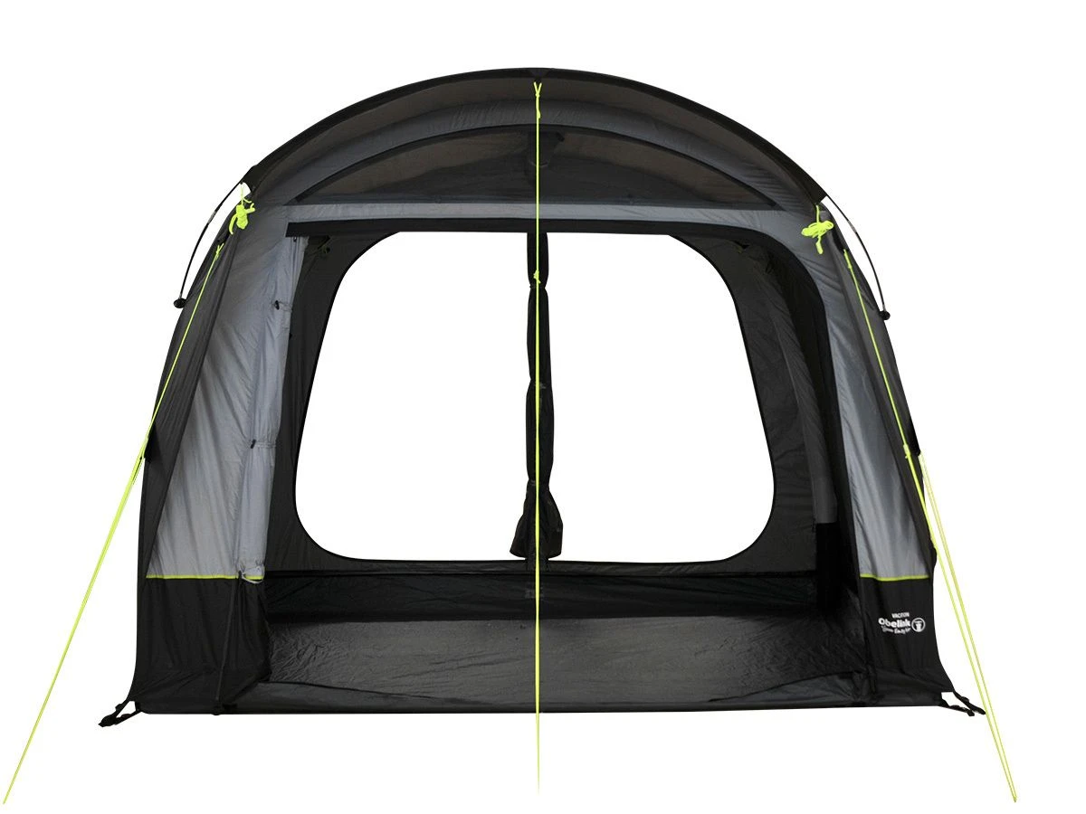 Das Obelink Vacation Easy Air hat eine Vorderwand, die Sie komplett oder teilweise zur Seite aufrollen können. Wenn Sie die Vorderwand Bis zur Hälfte zur rechten Seite aufrollen, entsteht rechts ein großer Eingang. Wenn Sie die Vorderwand vollständig aufrollen, haben Sie einen großen offenen Durchgang zum Bus. In der Vorderwand befinden sich zwei große Fenster, die Sie von innen mit einem Vorhang öffnen bzw schließen können. Oben befindet sich eine große Belüftungsöffnung, die Sie auch von innen öffnen und wieder schließen können.