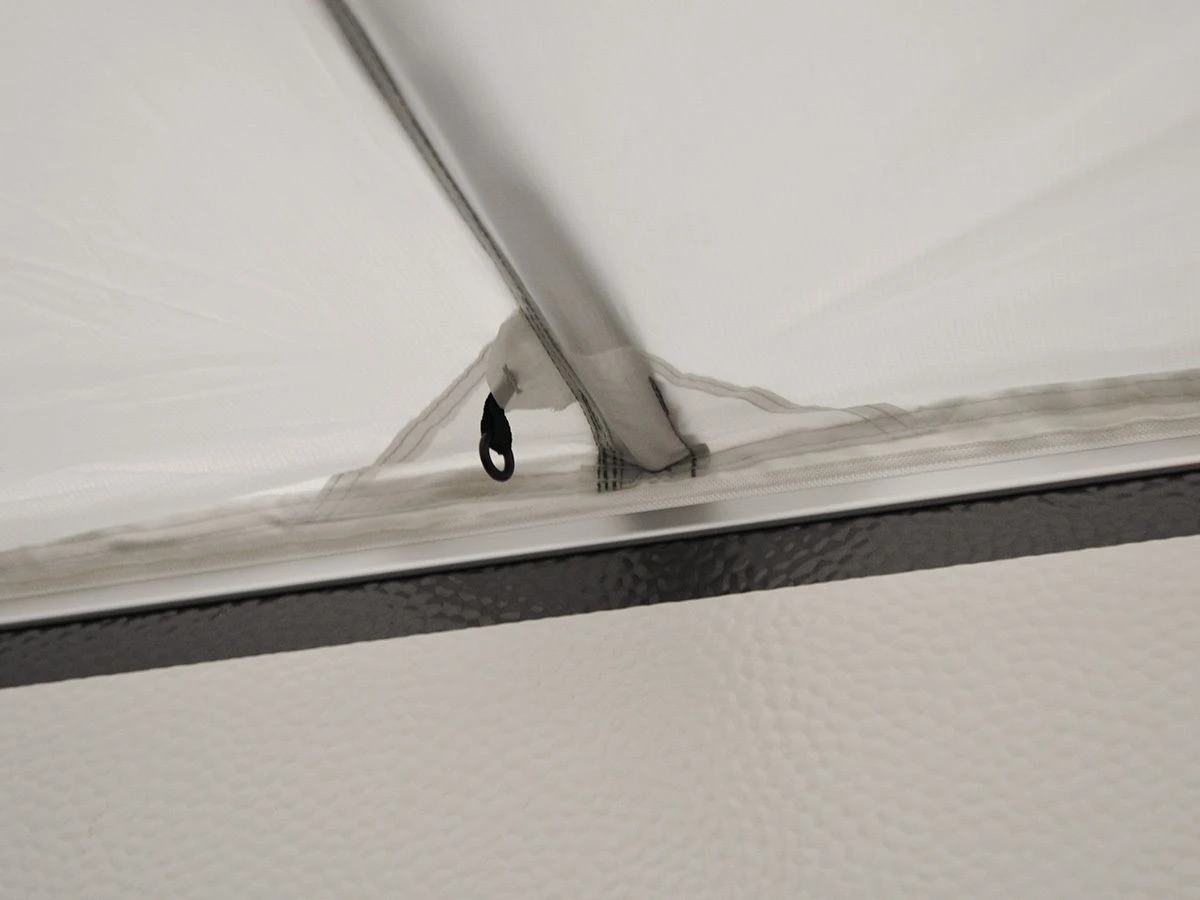 Damit das Vorzelt gut an der Wohnwagenwand anschließt, sind sie Seitenwände an der Rückseite mit Schaumkissen versehen. Diese können Sie an der Unterseite mit den mitgelieferten Heringen ganz einfach befestigen. Dadurch schließt das Schaumkissen direkt an der Wand an.